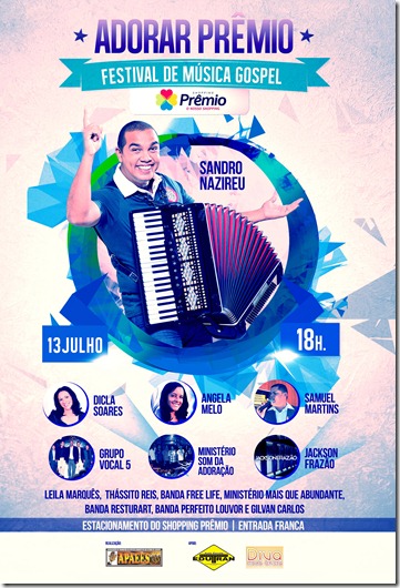 O estacionamento do Shopping Prêmio, localizando há menos de dez quilômetros do Centro de Aracaju, será dominado por muita adoração na noite da próxima sexta-feira, 13, a partir das 18h. O I Adorar Prêmio, festival gospel com entrada franca, contará com a participação do artista baiano Sandro Nazireu, além de destaques locais como Jackson Frazão, Samuel Martins, Ângela Melo e Ministério Som de Adoração. Ao todo, o evento contará com a participação de 13 artistas.